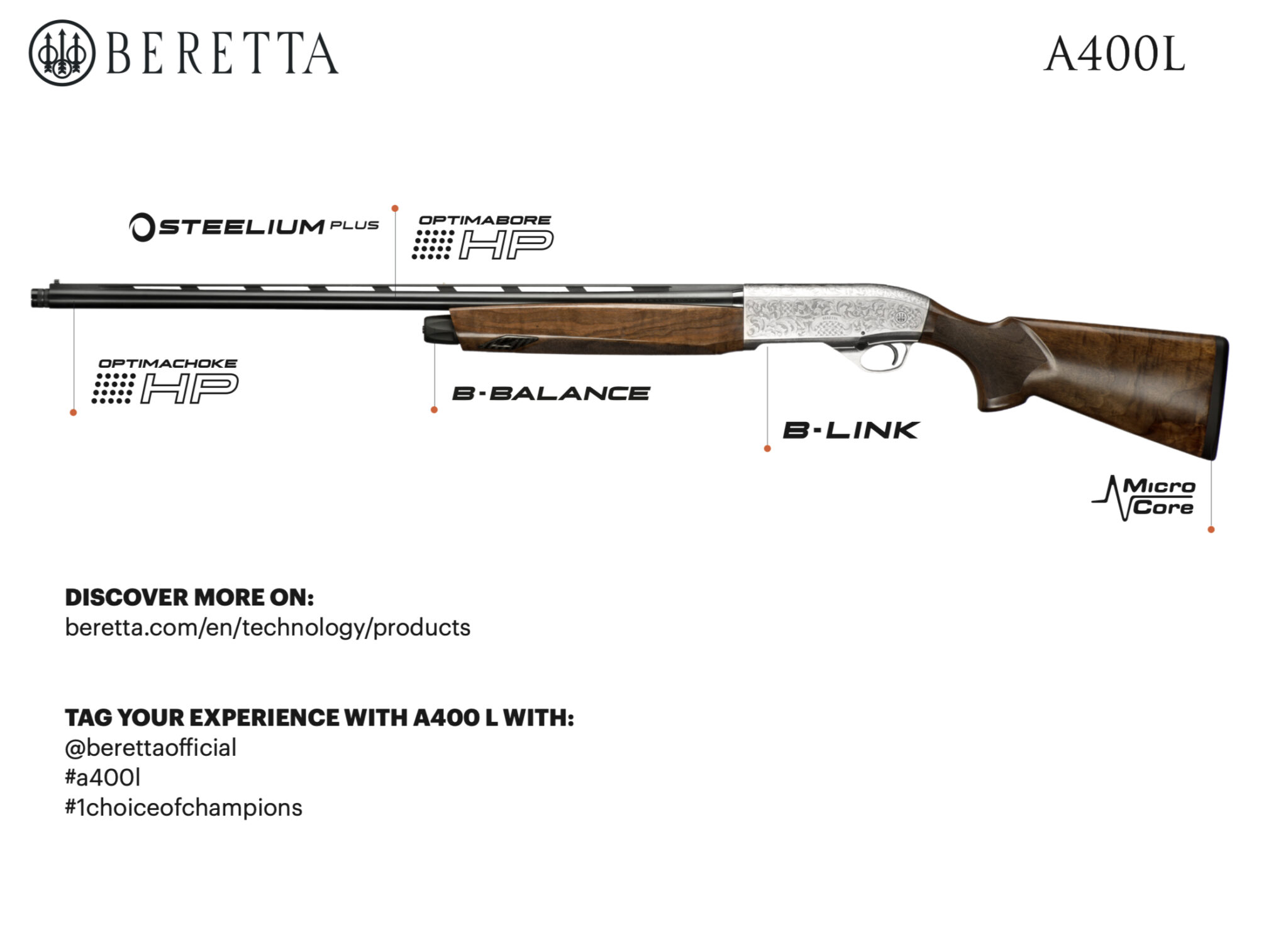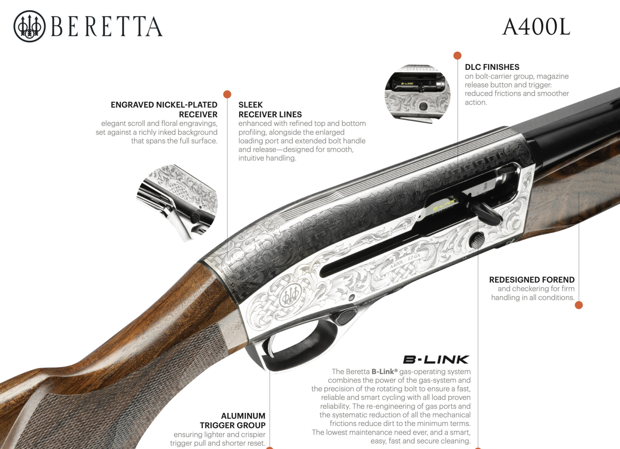 The new Beretta A400 L, the elegant iteration of the Beretta A400 Xcel Sporting features an exclusive, eye-catching engraving and a highly figured European walnut wood for the redesigned for-end and stock, all completed with DLC-finished components to combine further reduced frictions, unparalleled resistance, and a contemporary touch.
