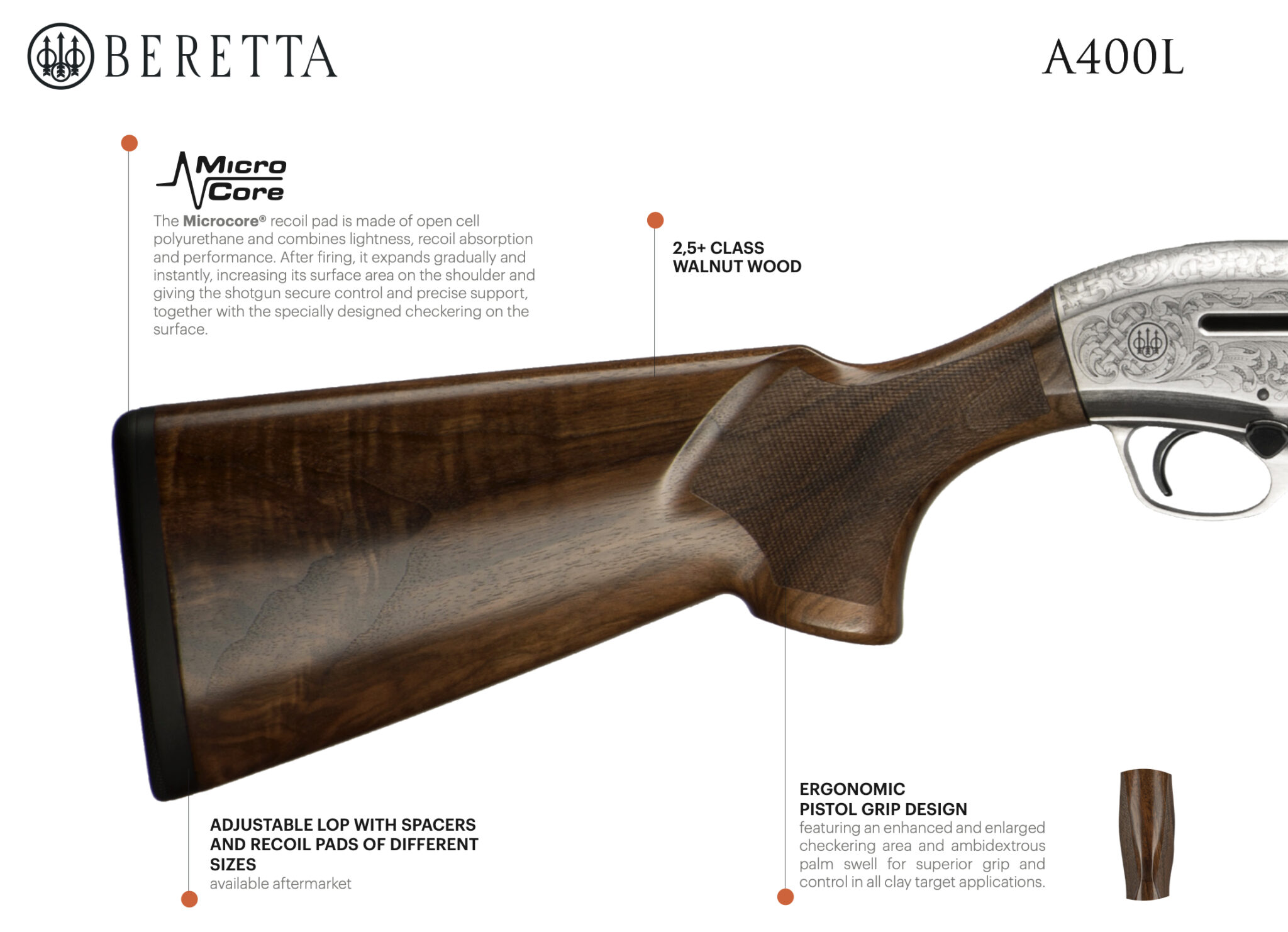 The Beretta A400 L Xcel Sporting also features, grade 2.5 walnut stock with a fitted Microcore recoil pad.