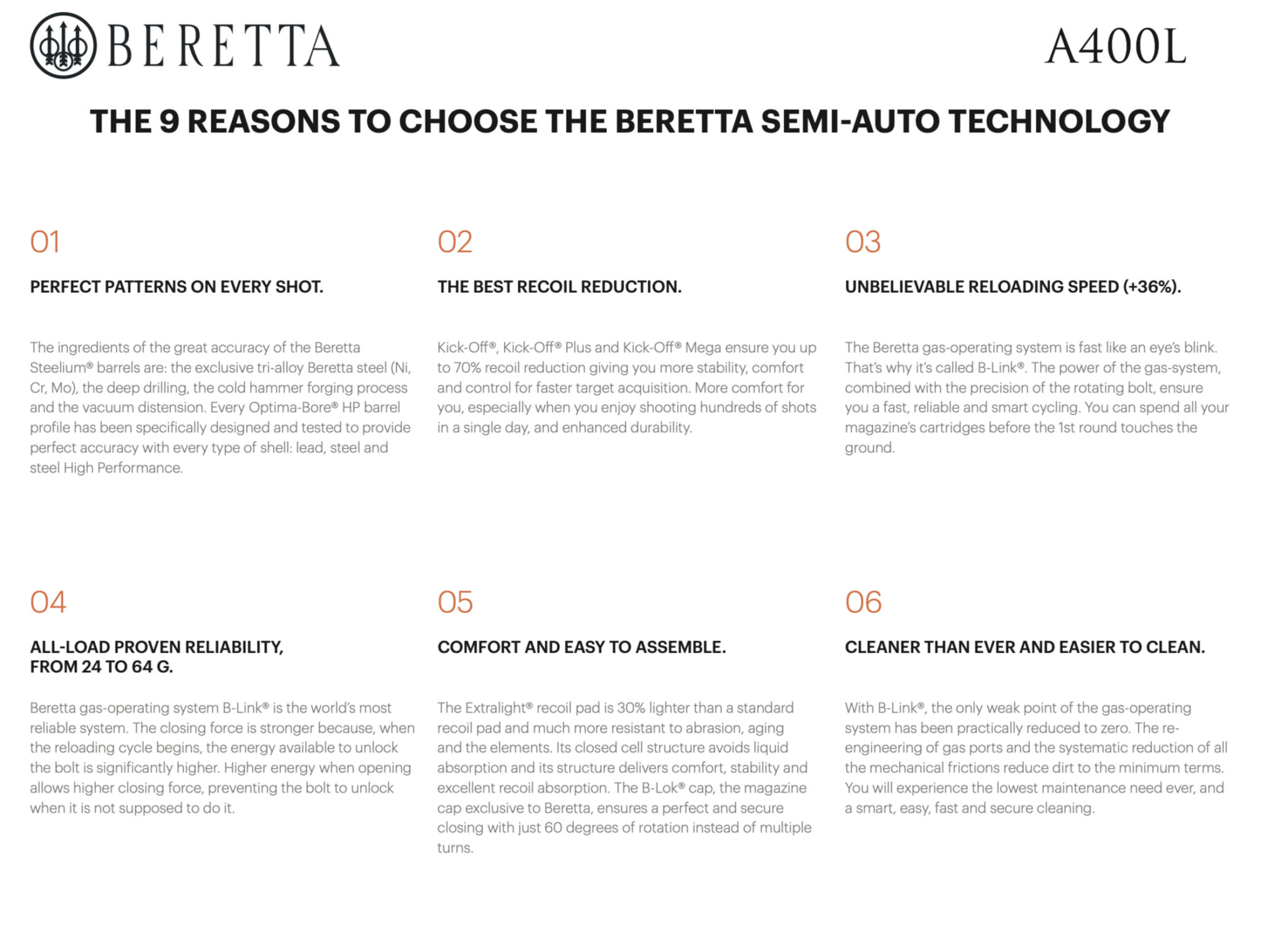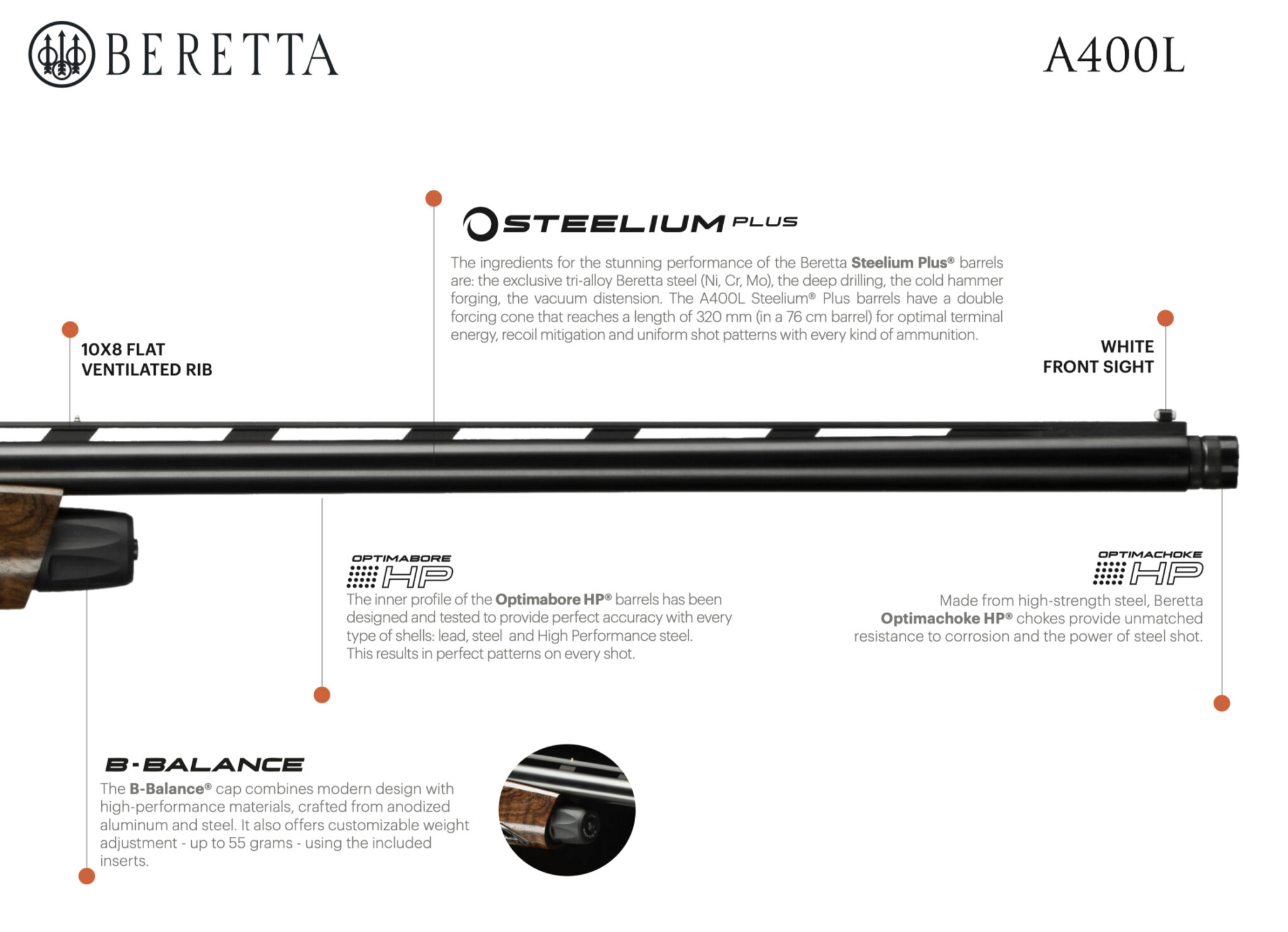 The A400L includes the renowned ballistics of the Beretta Steelium® Plus barrel with its triple progressive forcing cone (up to 320 mm) for optimal terminal energy, recoil mitigation and uniform shot patterns with every kind of ammunition. 10×8 mm flat vent rib.