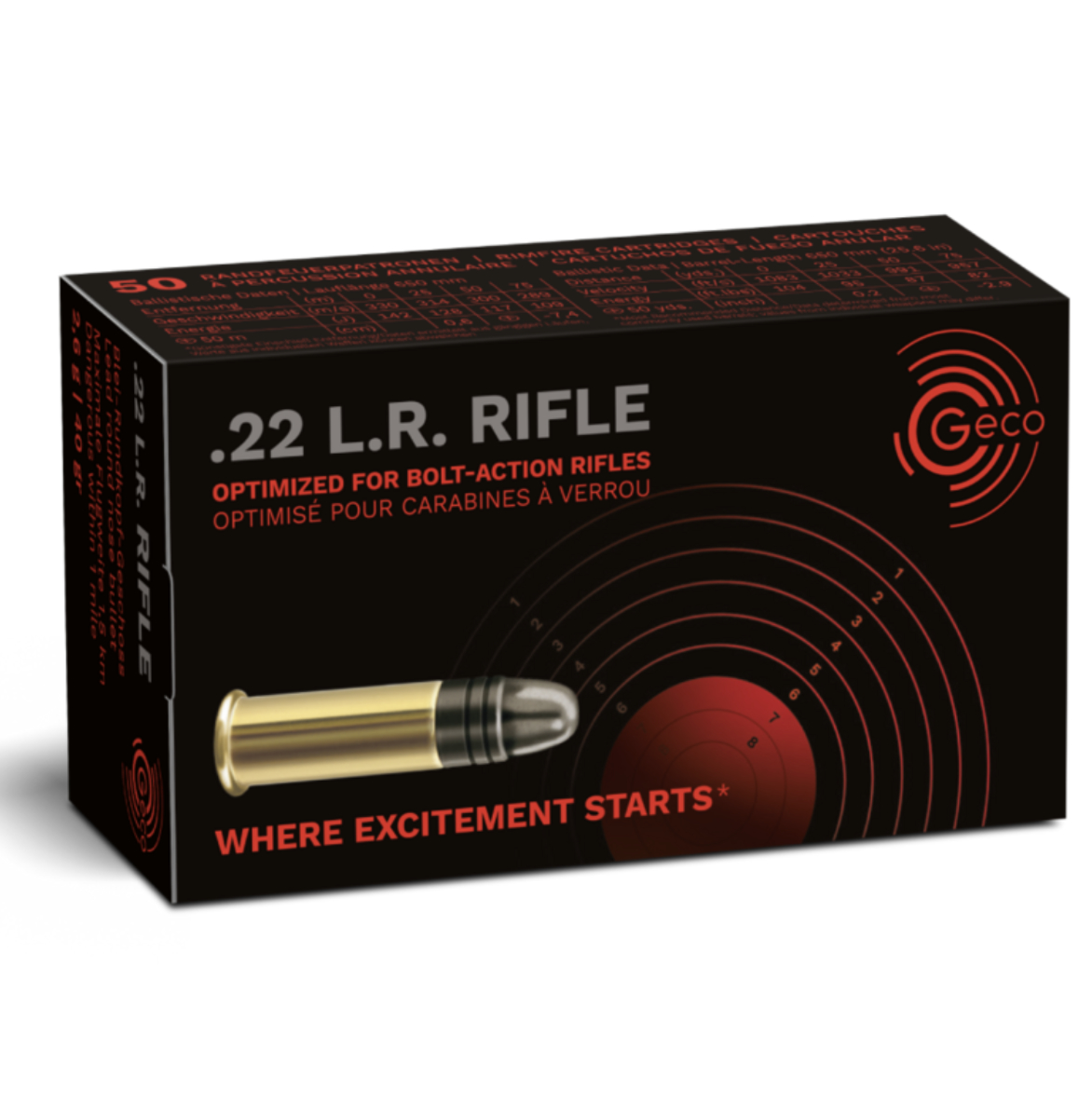 Geco .22 lr Rifle 40 grain. Lead round nose bullet. Otimized for bolt-action rifles. Where excitement starts!