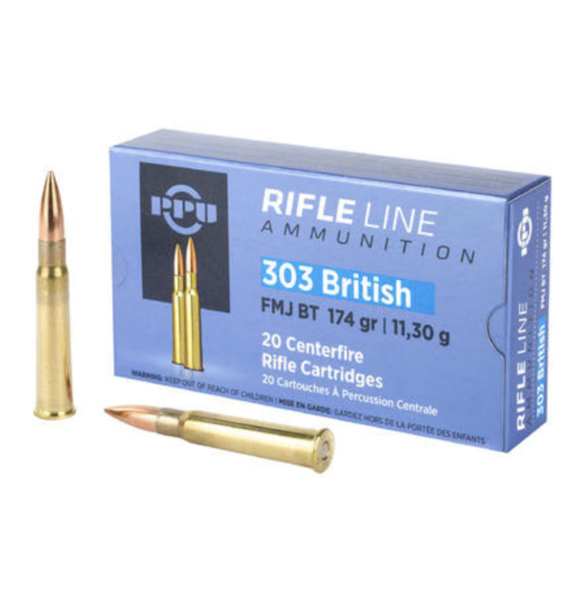 PPU Rifle Line ammunition 303 British FMJ BT 174 grain Full Metal Jacket 20 centerfire rifle cartridges.