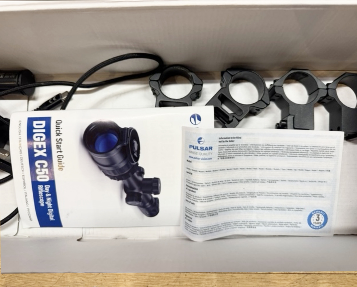 Pulsar Digex C50 Day & Night Digital Riflescope Used non wifi version in excellent condition. Comes with Clulite infrared torch and adaptor, set of 30mm Piccatinny and Dove-tail mounts, Rechargeable batteries and charger. Instructions booklet and extra accessories included in the photos.