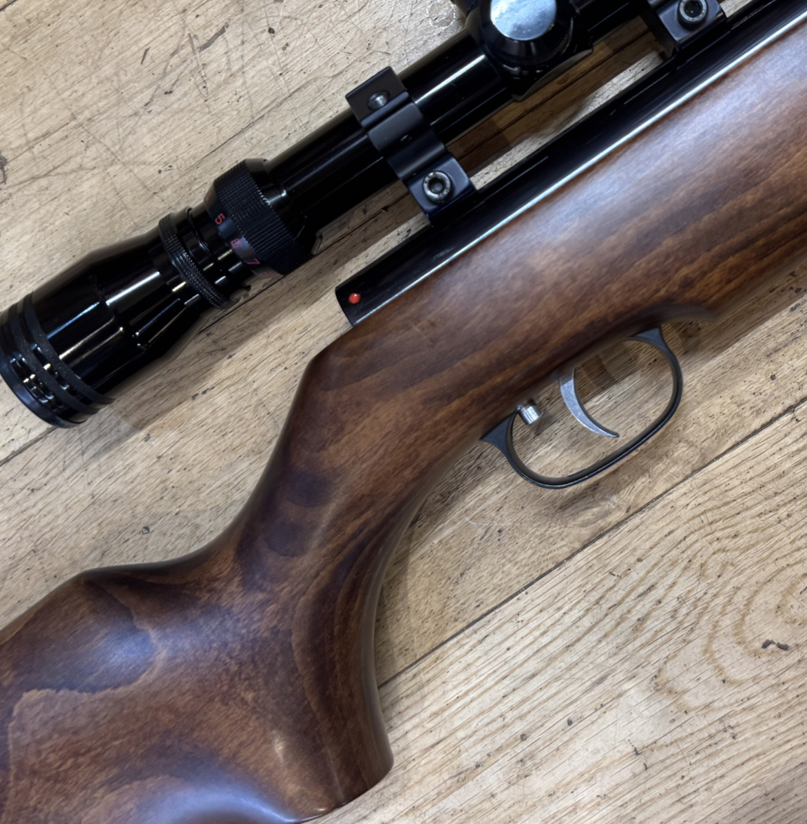 Weihrauch HW57 K .22 used under-lever spring powered air rifle with a Simmons scope and mounts. In excellent condition. Nicely figured walnut stock.