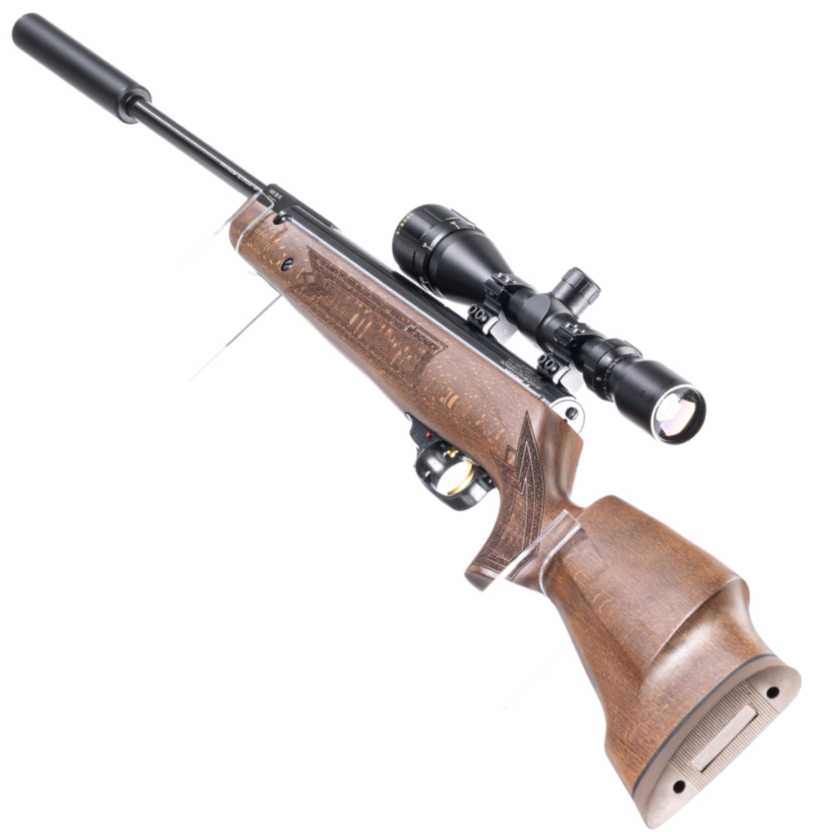 The Weihrauch HW 90 comes with a Weihrauch sound moderator/silencer included. The scope is not included at this price. We stock a wide range of scopes, available at discounted prices when purchased with your new air rifle.